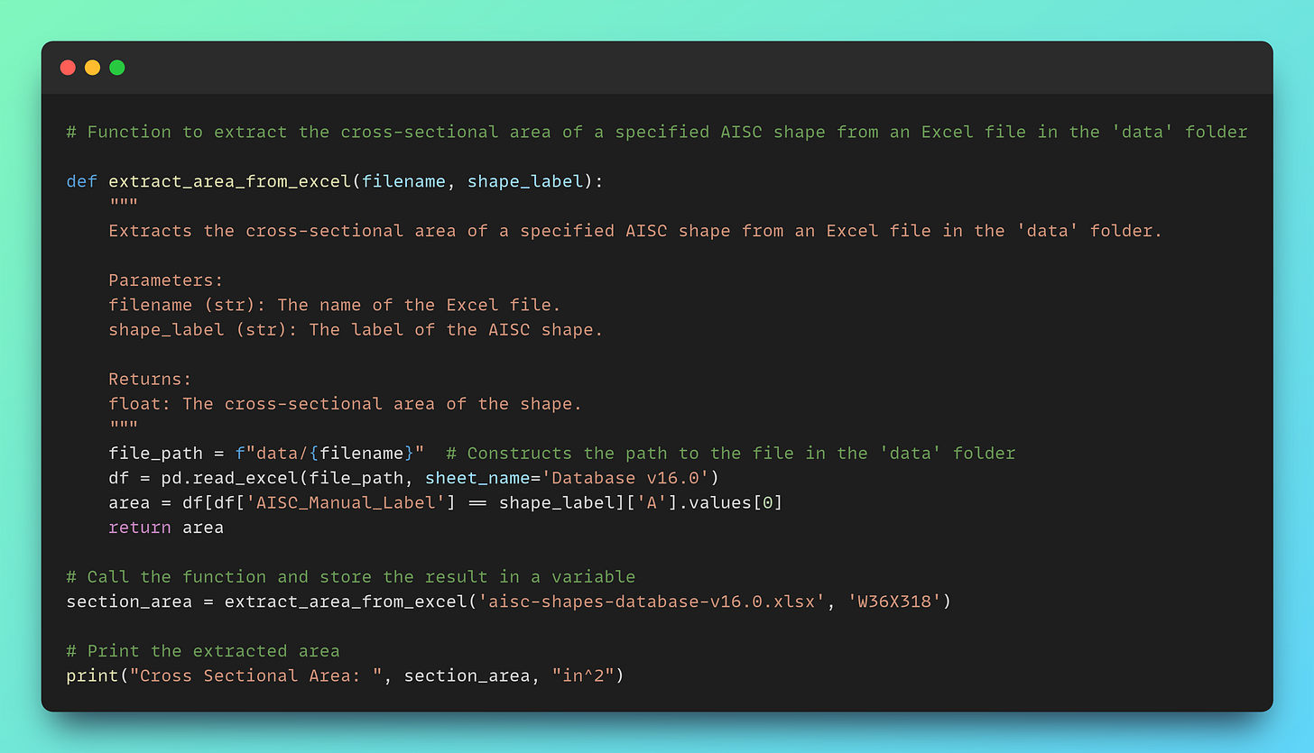 Extracting Data from AISC Shapes Database: The code extracts the cross-sectional area of a specific AISC shape (e.g., W36X318) from the AISC Shapes Database, which is provided in an Excel file. It utilizes Pandas to read the data and extract the required information, providing the cross-sectional area of the steel section in square inches.