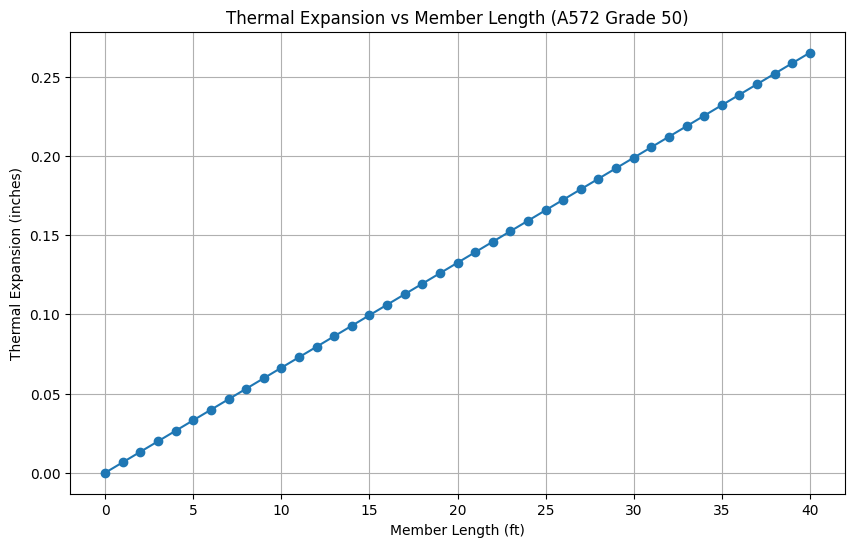 Thermal Expansion Analysis in Python: The code then analyzes the thermal expansion of a steel member subjected to these potential temperature changes. It uses the coefficient of thermal expansion for A572 Grade 50 steel, previously extracted temperature data, and a range of member lengths to calculate and plot thermal expansion versus member length.