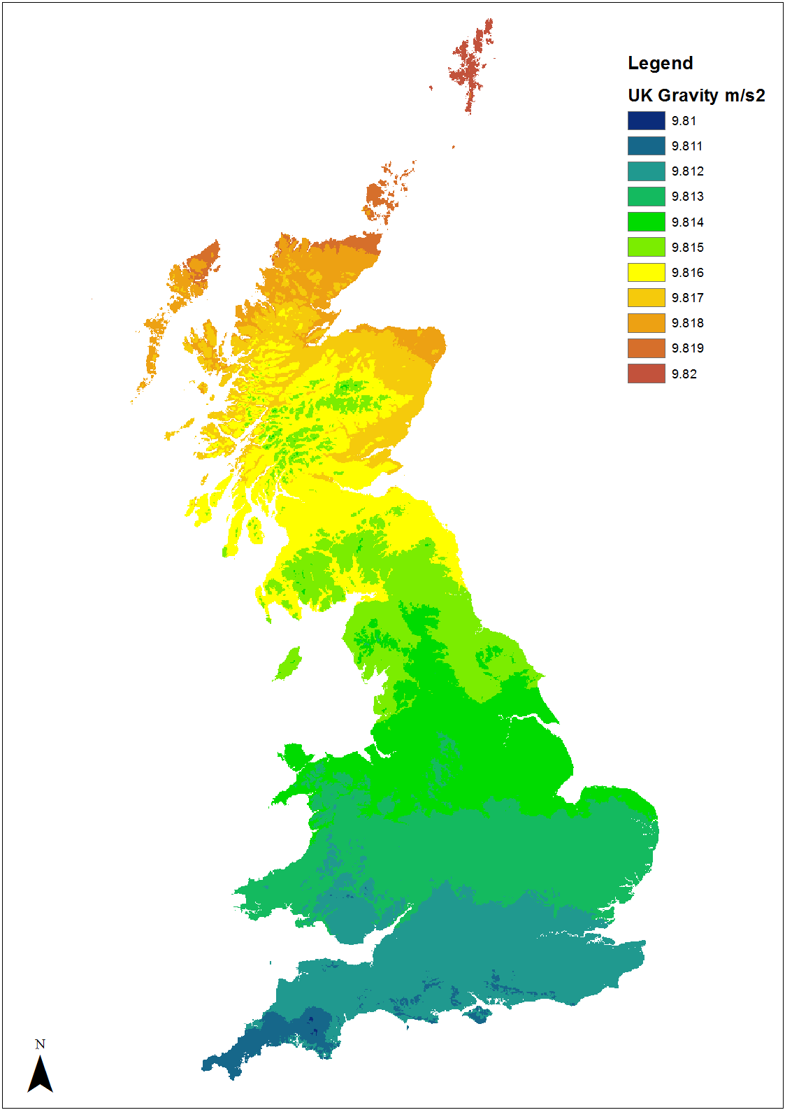 I have been notified by the eagle eyed Peter Debney, that the gravitational constant above is not a constant and varies with location on the planet. He’s even gone as far as to provide a reference map of the UK’s gravitational range (below). Peter discovered this while investigating space elevators. At sea level, ‘g’ typically ranges from about 9.766 m/s² at the equator to about 9.866 m/s² at the poles, which results in approximately a 1% difference.